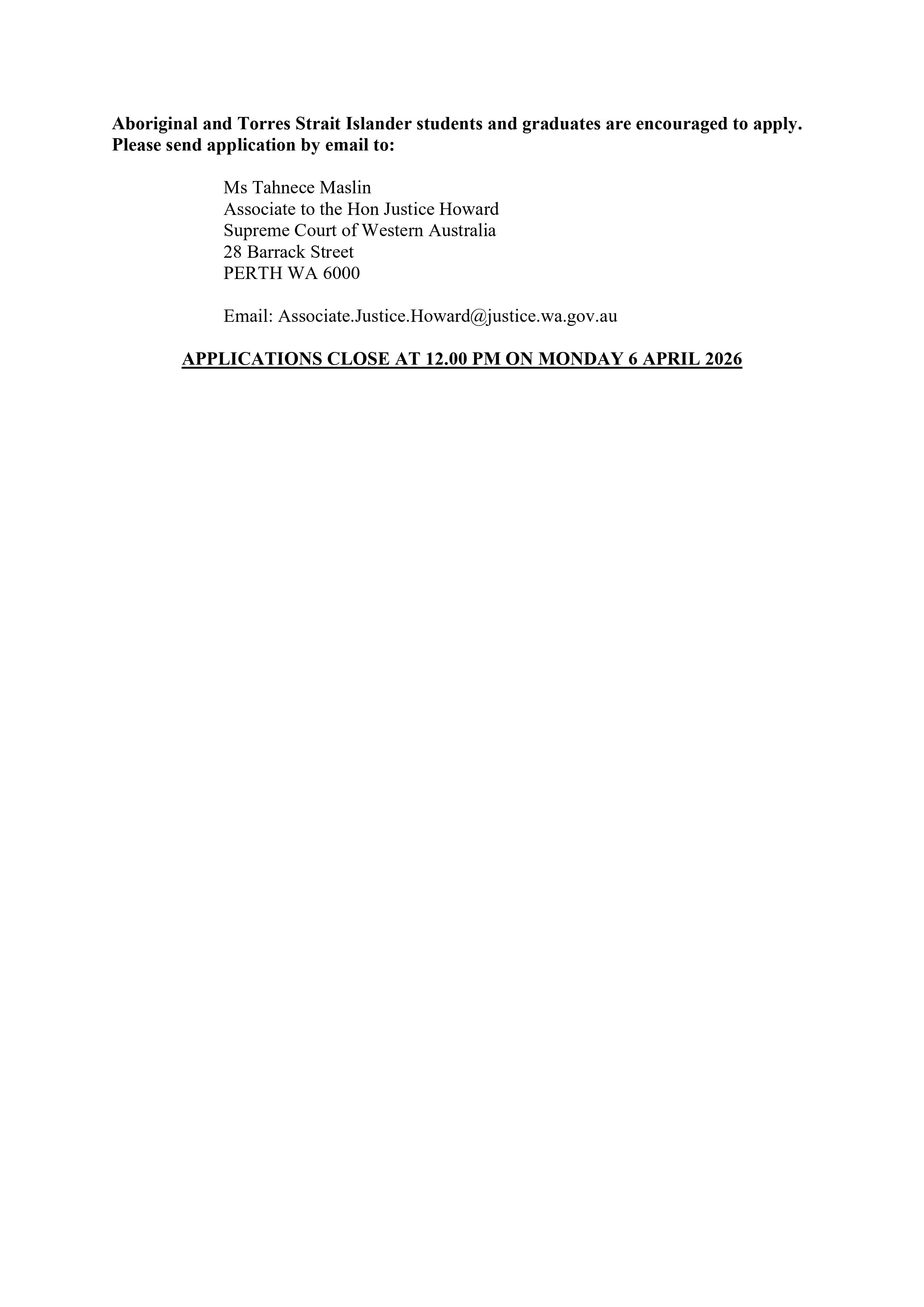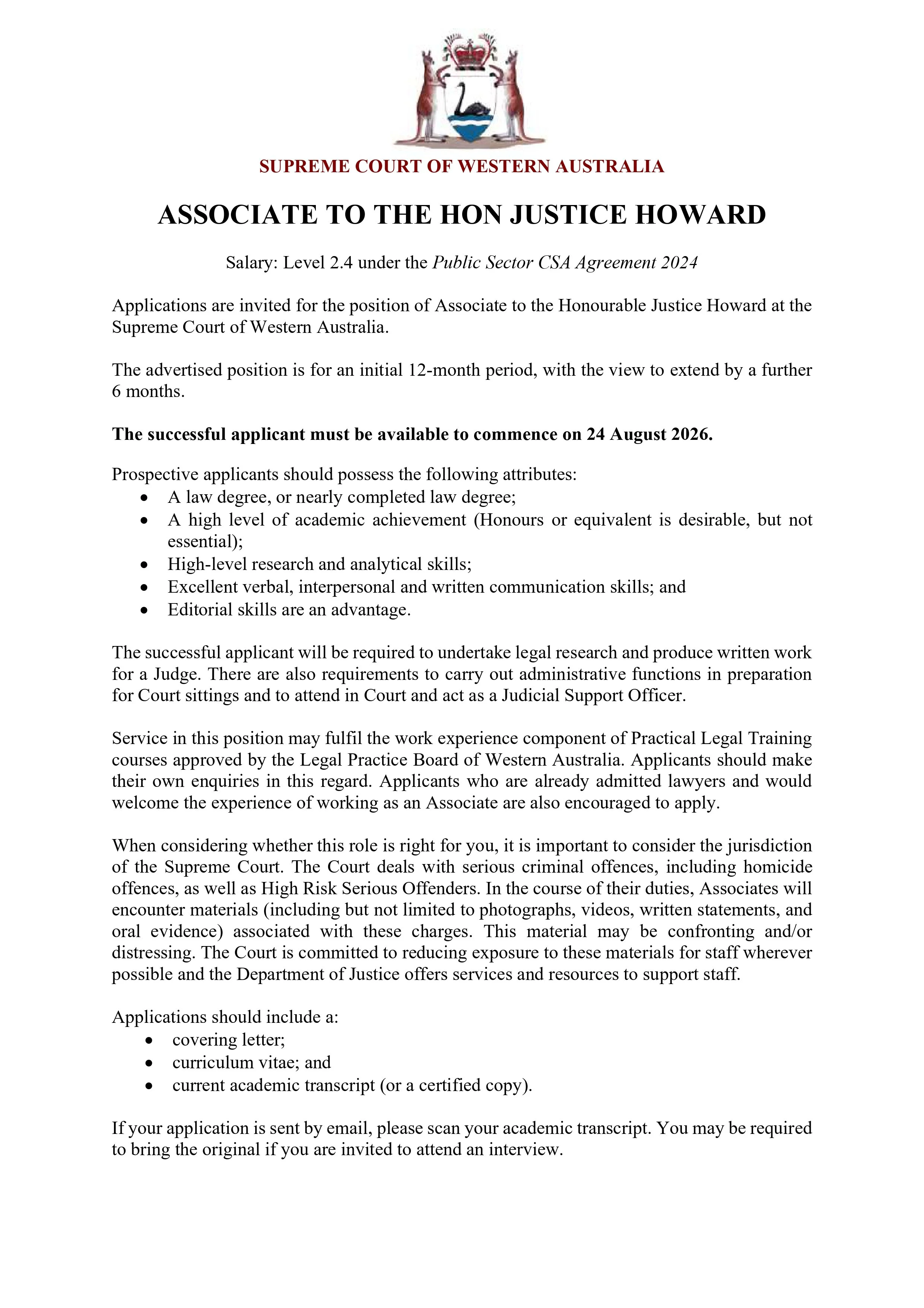 2026 Associate Position - Supreme Court of Western Australia